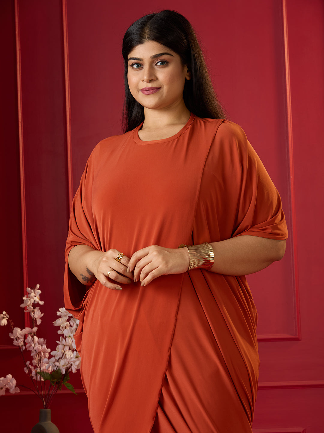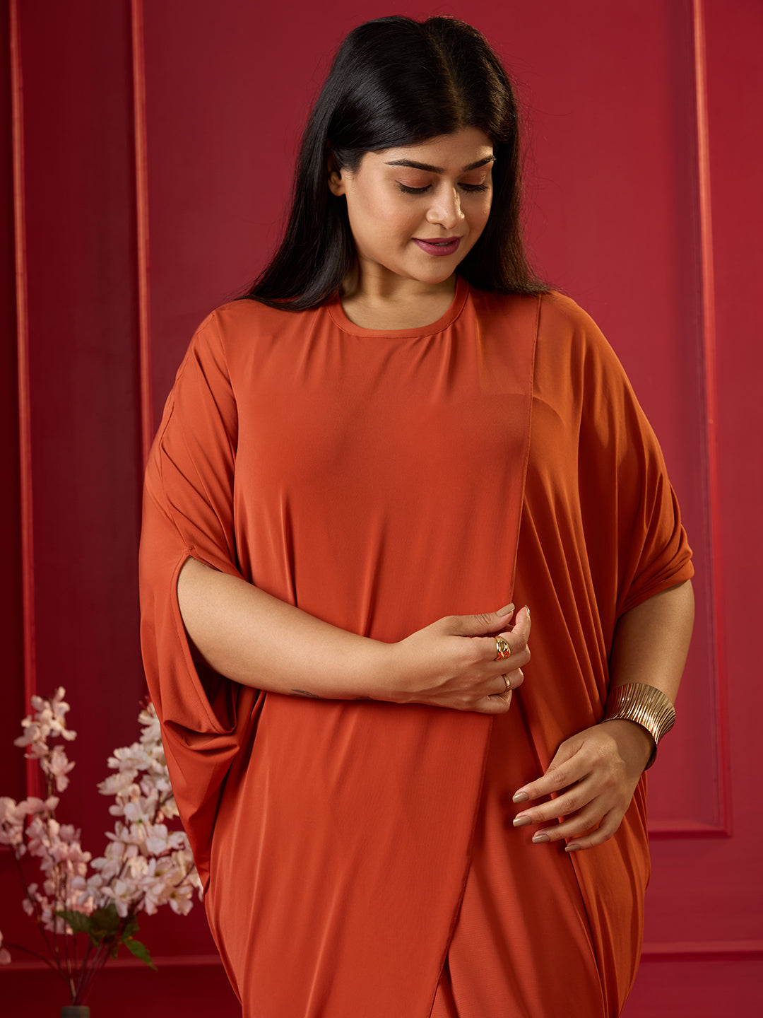 • Make a stunning entrance in the Terracotta Glow Draped Tulip Dress. Crafted from luxurious premium ITY stretch fabric, this effortlessly elegant piece features a soft drape and flattering cocoon silhouette. Designed for versatile styling, it’s the perfect choice for making a graceful, statement-worthy appearance.