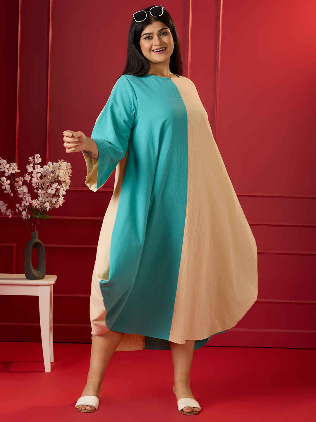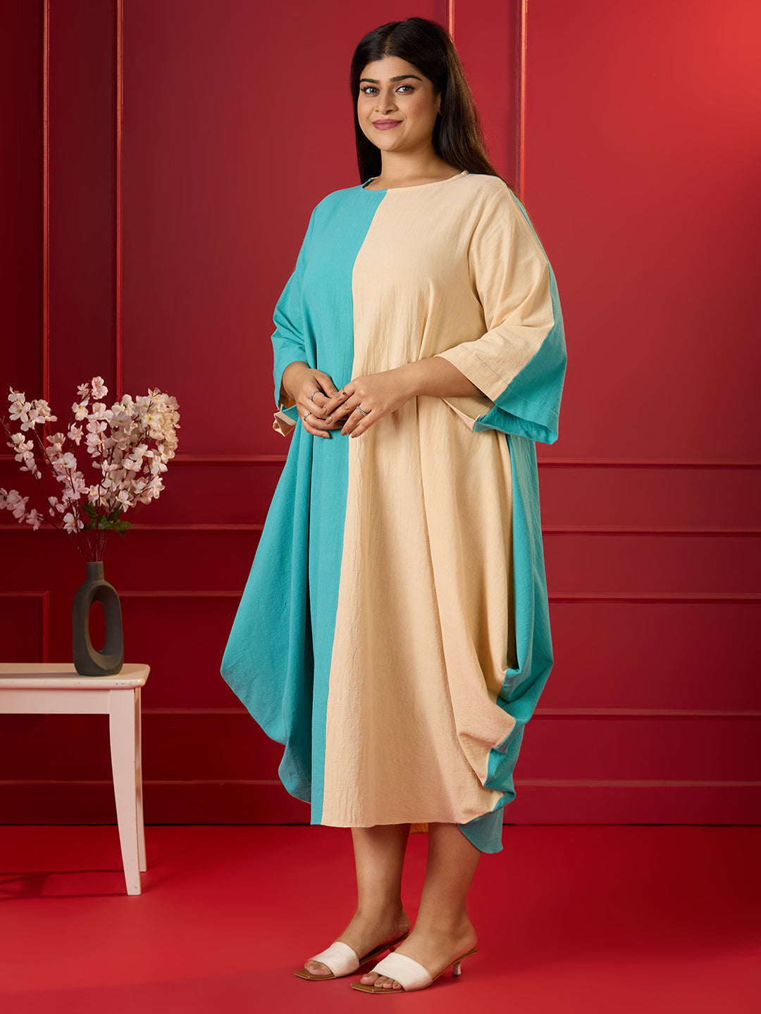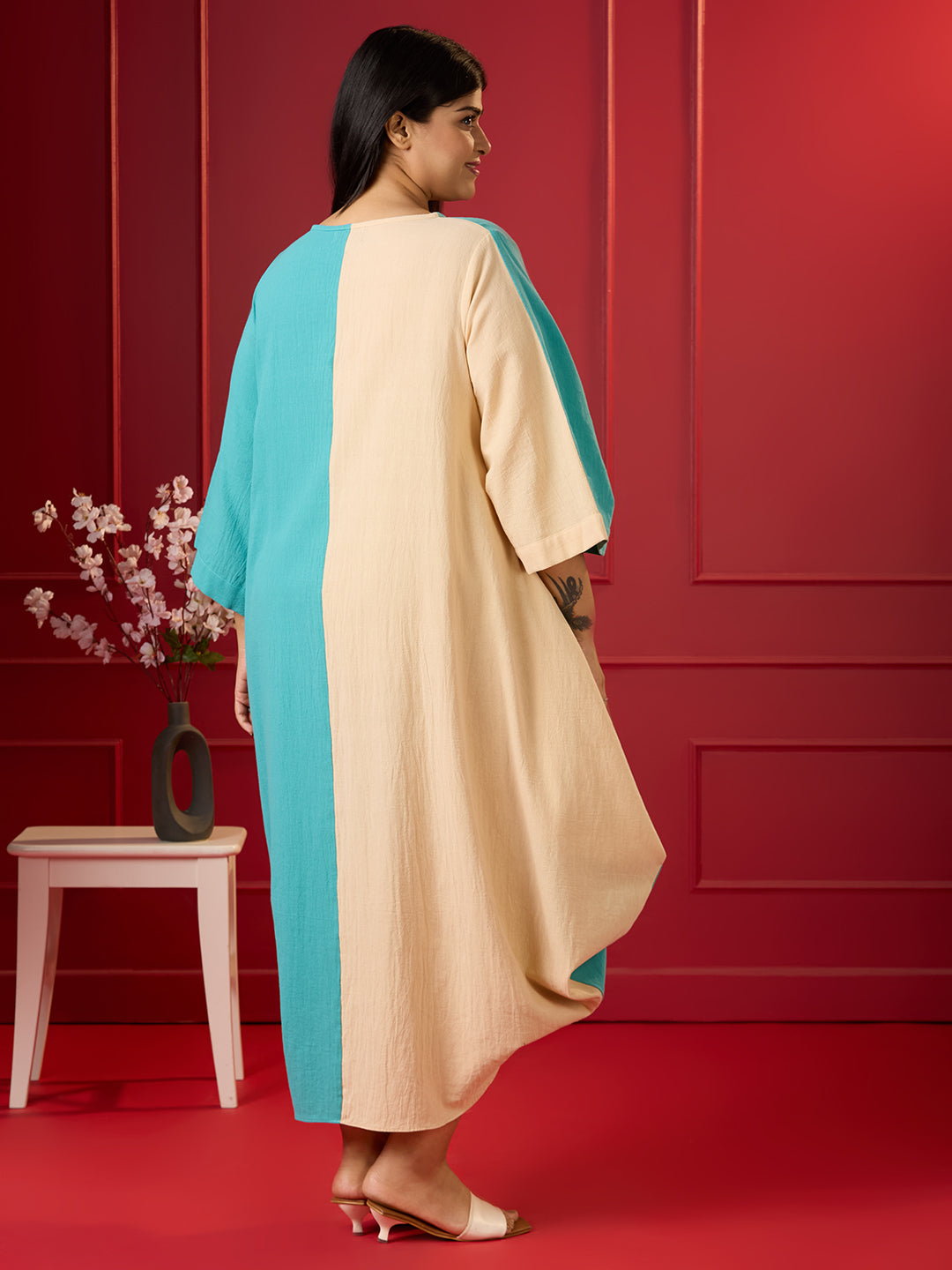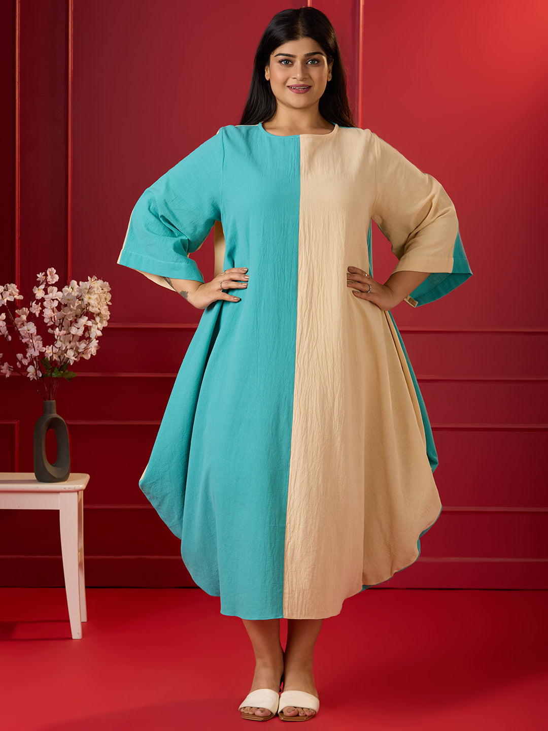 • Bold color-blocking meets breathable ease in the Dual-Tone Linen Dress. Crafted from premium linen, this dress features a striking aqua and sand panel design that brings a modern, minimal edge. The relaxed, draped silhouette flatters every curve while offering absolute comfort, making it a standout choice for both daywear and travel.